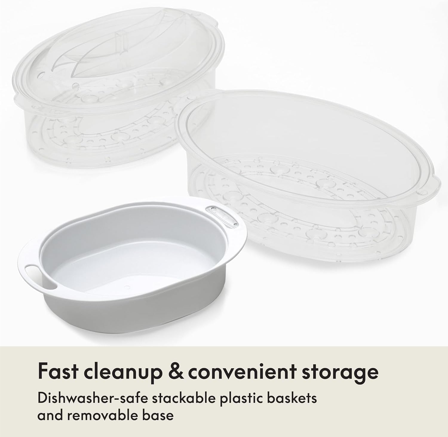 The two stackable glass baskets allow you to cook separate foods at the same time. This setup prevents flavors from mixing and helps you prepare balanced meals quickly. The transparent glass design lets you monitor progress without lifting the lid, which helps maintain steady steam levels. The removable base makes the appliance easy to clean and store, adding to its everyday practicality.