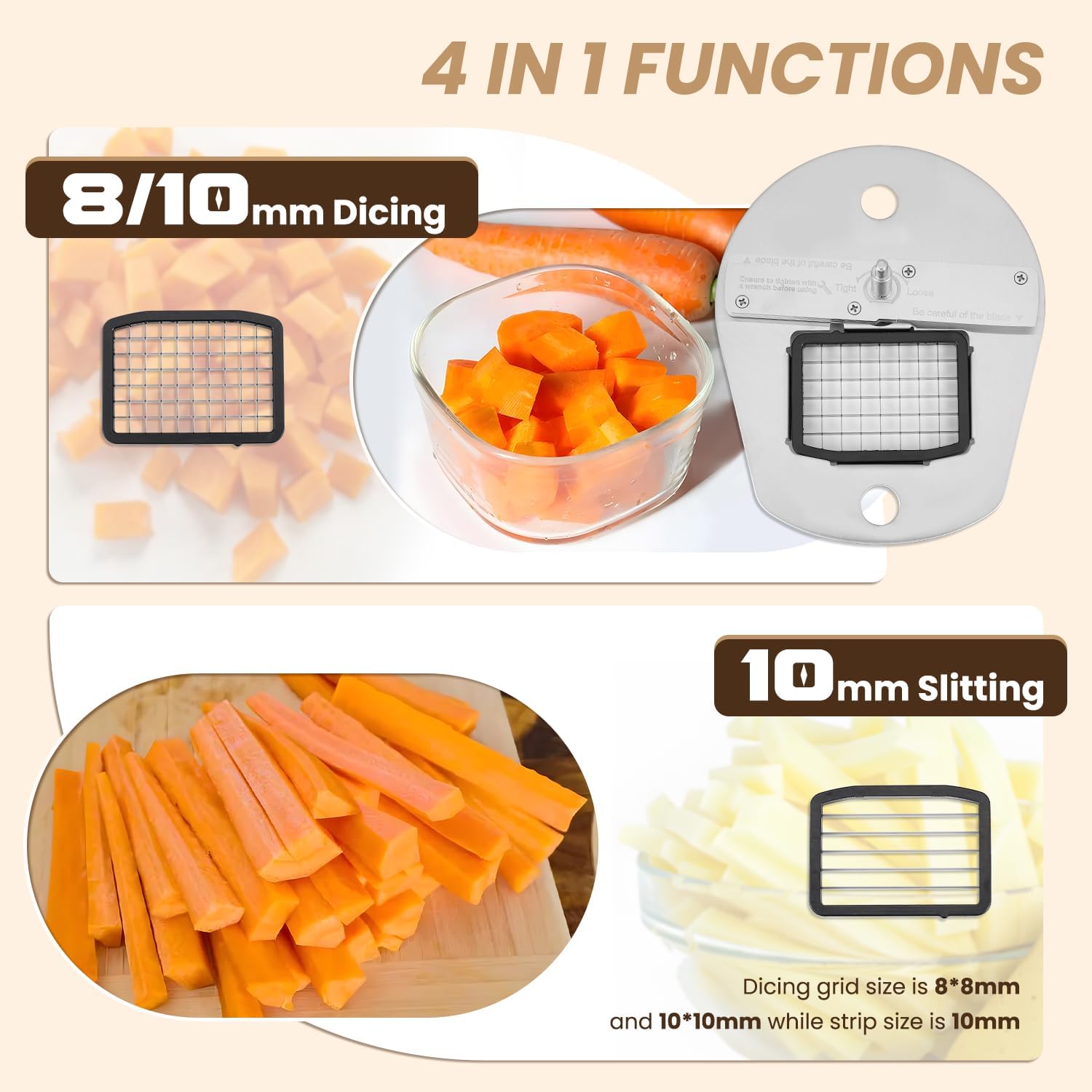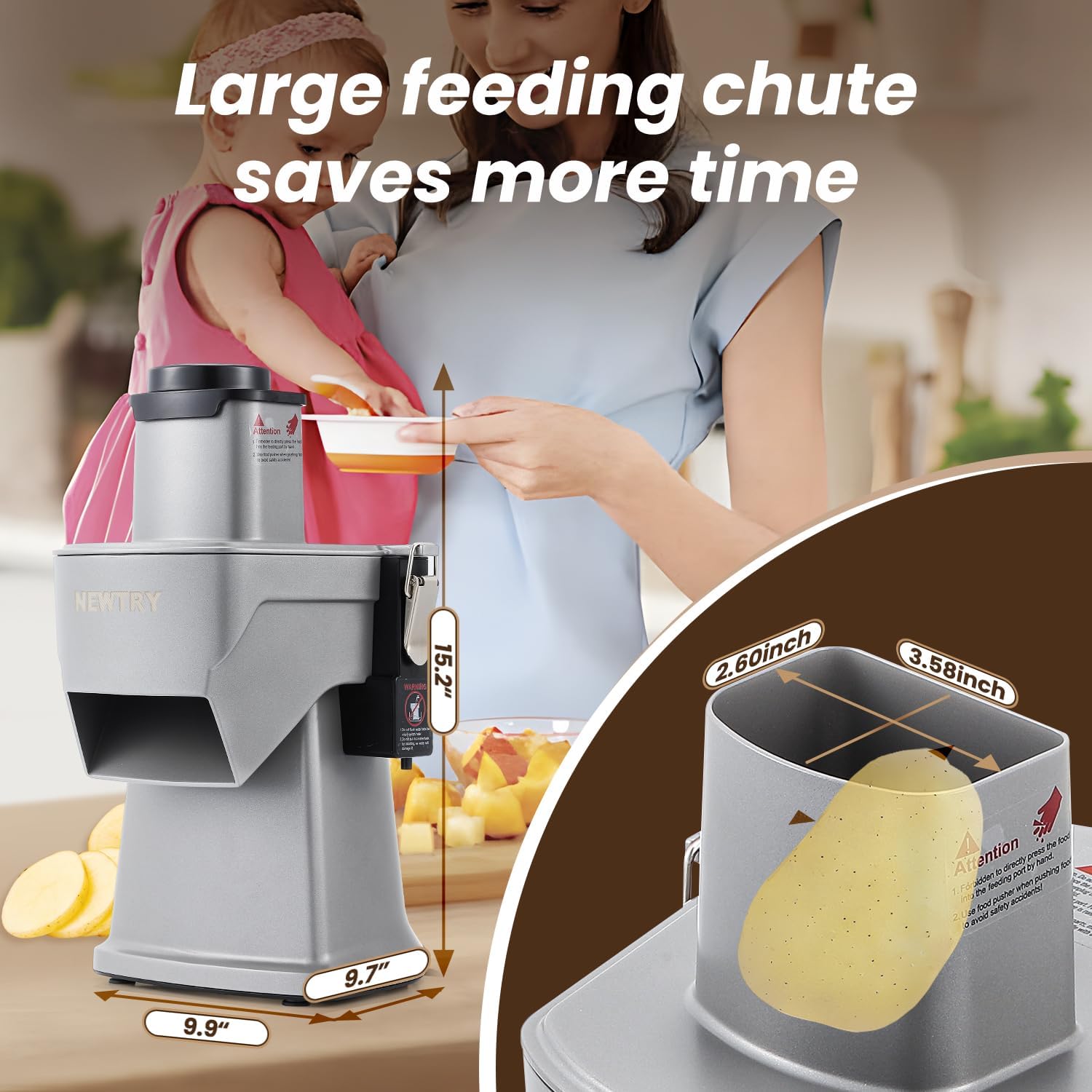 The electric vegetable slicer dicer shredder from NEWTRY is a commercial‑grade 4‑in‑1 prep machine designed for kitchens that need speed, precision, and consistent results. The NEWTRY 4‑in‑1 Electric Vegetable Slicer Dicer Shredder & Cutter handles vegetables and fruits with professional accuracy, making it ideal for restaurants, catering services, meal‑prep businesses, and home cooks who want reliable performance. Built with a durable aluminum body and stainless steel components, it delivers long‑term strength and efficient operation.